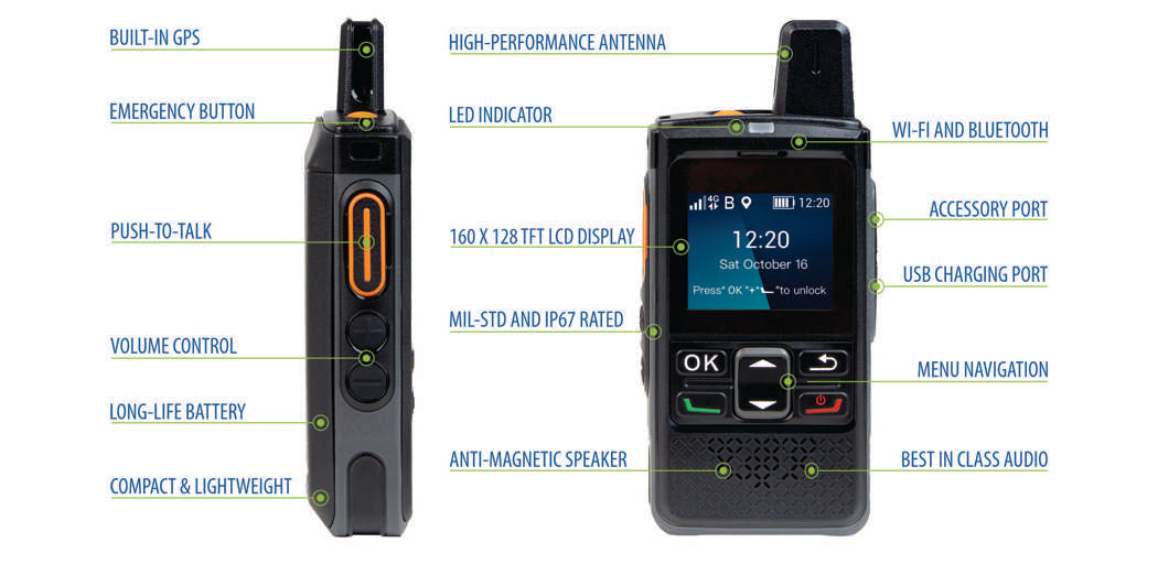 The POC-OBR radio is an ultra-compact, rugged, and easy-to-operate push-to-talk over cellular radio that supports connectivity over 4G/LTE and Wi-Fi for wide-area radio communications. It is cost-effective, and surprisingly feature rich for the price. The compact size enables one-hand operation, and the POC-OBR radio can be carried in pocket, worn on the standard belt clip, or worn on a lanyard.